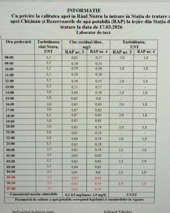 La această oră, calitatea apei din râul Nistru rămâne stabilă, fără a exista riscuri pentru alimentarea cu apă a municipiului Chișinău.